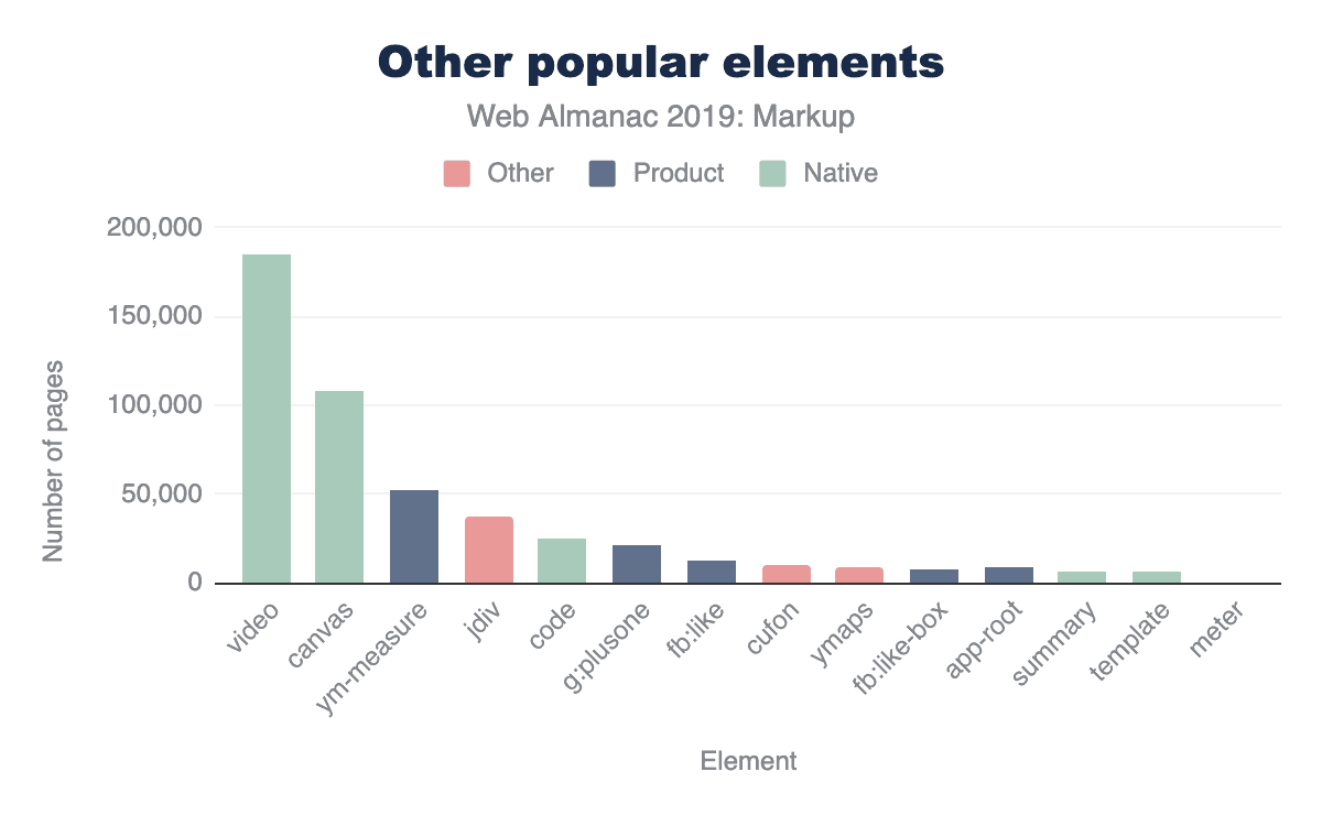 ほとんどの要素は、ネイティブの物も含めてページの1%未満として現れていますが、それでも非常に重要であり成功しています。たとえば<code>は私が頻繁に使用する要素です。 これは間違いなく便利で重要ですが、ページの0.57%でしか使われていません。この部分は私達の測定対象に基づいているため偏っています。通常、ホームページは特定の種類のもの(たとえば<code> など)が含まれる可能性は低いでしょう。例えば、ホームページでは見出し、段落、リンク、リスト以外はあまり一般的ではないでしょう。ただし、データには一般的に価値があります。