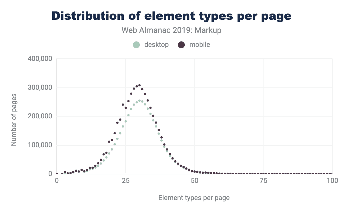 2019年7月の時点で、HTTP Archiveは、約440万のデスクトップホームページと約530万のモバイルホームページのDOMで使用されているすべての要素名の収集を開始しました。 (方法論の詳細を御覧ください)