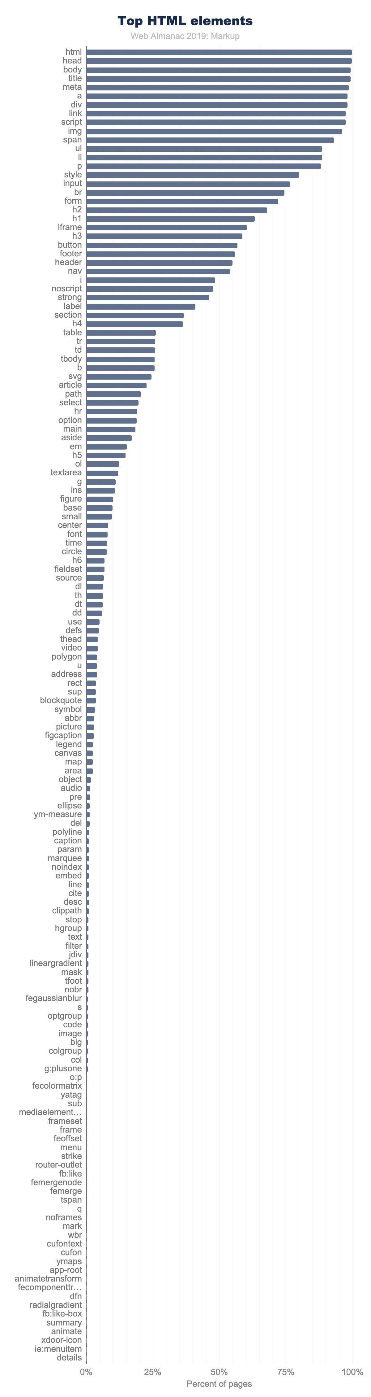ここでは2つのことを確認できます。まず、使用率が1%を超える要素の塊は、HTMLだけではありません。実際、最も人気のある100個の要素のうち27個はHTMLではなくSVGです! さらに、その隙間または近くには非標準のタグもあります!そして多くのHTML要素がページ毎に1%未満として現れている事に注意してください。