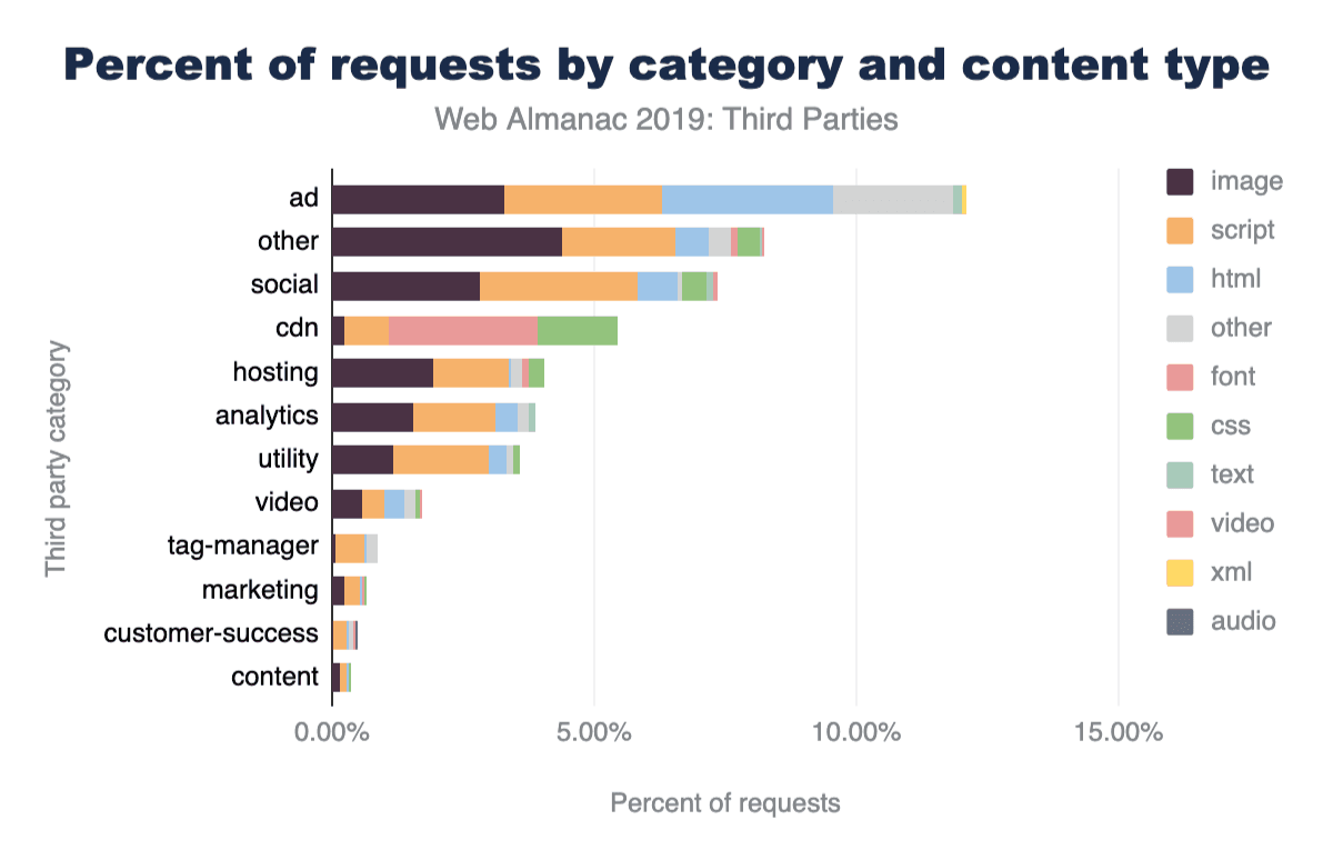 サードパーティのコンテンツはどこにでもあります。これは驚くべきことでありません。ウェブの基本は、相互接続とリンクを可能にすることです。この章では、メインドメインから離れてホストされている資産という観点から、サードパーティコンテンツを調べてみました。もし、自己ホスト型のサードパーティ・コンテンツ(例えば、メイン・ドメインにホストされている一般的なオープンソース・ライブラリなど)を含めるとサードパーティの利用率はさらに高まっていたでしょう。