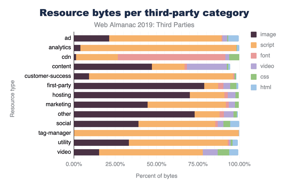 スクリプトの57%を提供しているにもかかわらず、サードパーティはスクリプトバイトの64%を占めています。つまり、サードパーティのスクリプトはファーストパーティのスクリプトよりも平均で大きくなっています。これは、次のいくつかのセクションで述べるパフォーマンスへの影響を示す早期警告の兆候です。