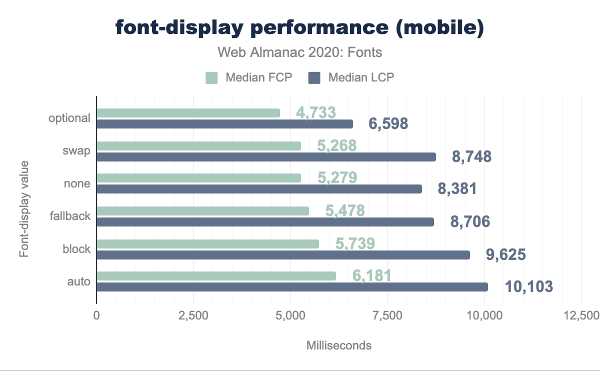 このデータからは、他にも2つの興味深い推論があります。blockの設定は、とくにモバイルではFCPに大きな影響を与えると予想されますが、実際にはその効果はそれほど大きくありません。これは、フォントアセットの待ち時間がWebページ全体のパフォーマンスを制限する要因になることはほとんどないことを示唆していますが、画像などのリソースが多くないページでは大きな要因になることは間違いありません。autoの設定(指定しなかった場合の設定)は、ブラウザ次第です。デフォルトではほとんどの場合にブロックされますので、blockとよく似ています。