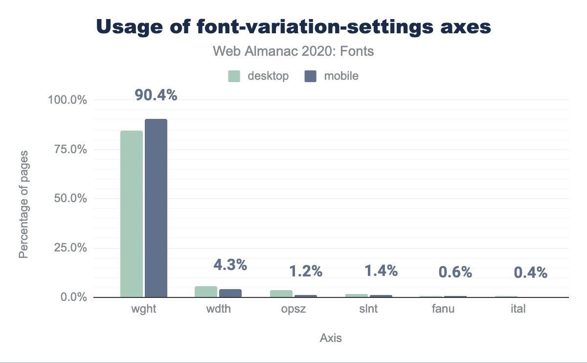 wghtが圧倒的に多く、残りのwdthはデスクトップで5.6%、モバイルで4.3%、opszはそれぞれ3.7%と1.2%、slntは1.8%と1.4%、fanuは0.5%と0.6%、italはデスクトップで0.5%、モバイルで0.4%となっており、wghtが圧倒的に多いことがわかります。もっともよく使われている軸はwght(重さを制御する)で、デスクトップで84.7%、モバイルでは90.4%となっています。しかし、wdth(幅)は可変フォントの使用率の約5%を占めている。2020年、Google Fontsは幅軸と重さ軸の両方を持つ2軸フォントの提供を開始した。