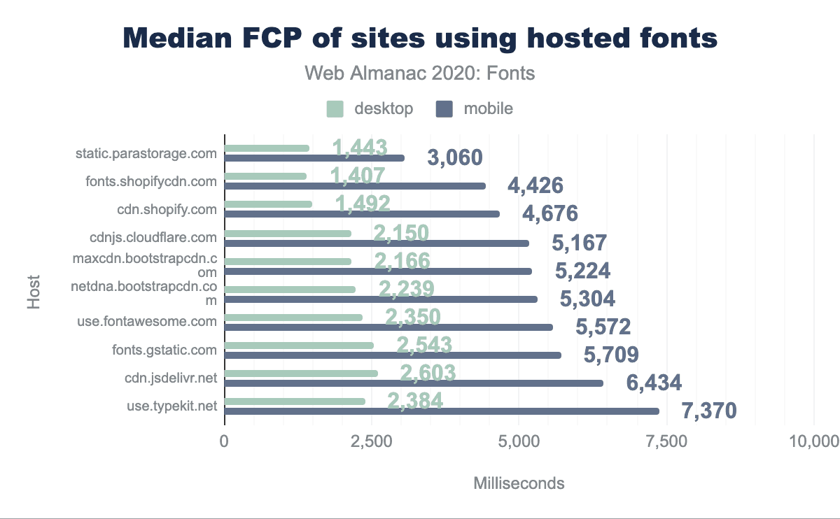 static.parastorage.comはデスクトップで1,443ミリ秒、モバイルで3,060ミリ秒ともっとも速く、fonts.shopifycdn.comはデスクトップで1,407ミリ秒、モバイルで4,426ミリ秒、cdn.shopify.comは1,492ミリ秒、4,676ミリ秒、cdnjs.cloudflare.comは2,150ミリ秒、5,167ミリ秒、maxcdn. bootstrapcdn.comは2,166と5,224、netdna.bootstrapcdn.comは2,239と5,304、use.fontawesome.comは2,350と5,572、fonts. gstatic.comは2,543と5,709、cdn.jsdelivr.netは2,603と6,434、use.typekit.netは2,384と7,370になっています。興味深いのは、さまざまなフリー/オープンソースおよび商用サービスを使用しているサイトの速度の違いです。コンテンツの初回ペイント(FCP)と最大のコンテンツフルペイント(LCP)の時間を見ると、Google Fontsを使用しているサイトはほぼ中央に位置していますが、一般的には中央値よりも少し遅くなっています。データセットの中でもっとも高速なサイトはShopifyとWix(parastorage.comからアセットを提供)であり、これらのサイトは少数の高度に最適化されたファイルに焦点を当てていると推測されます。一方、Googleは、(言語によって)サイズが大きく異なるWebフォントをグローバルに提供しており、その結果、中央値の時間が若干遅くなっていると思われます。