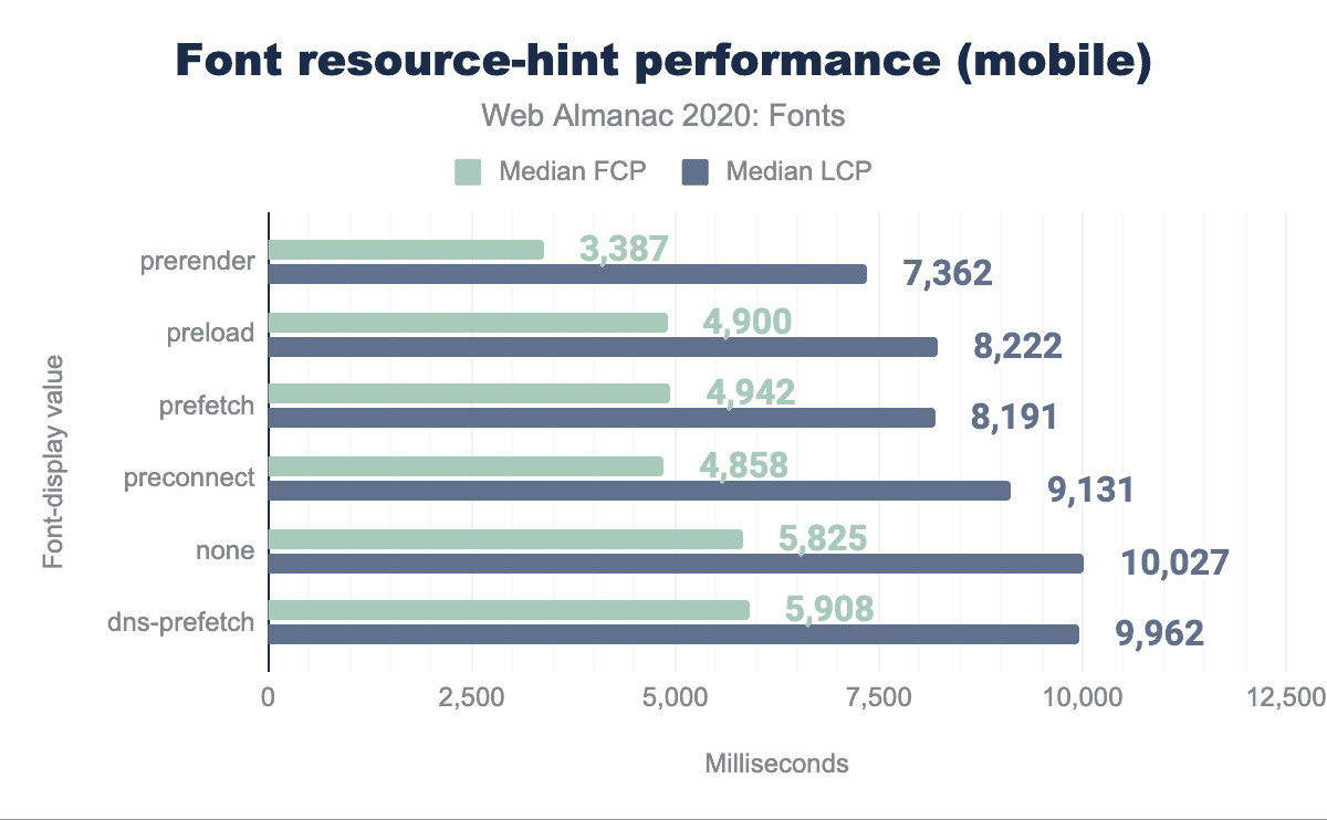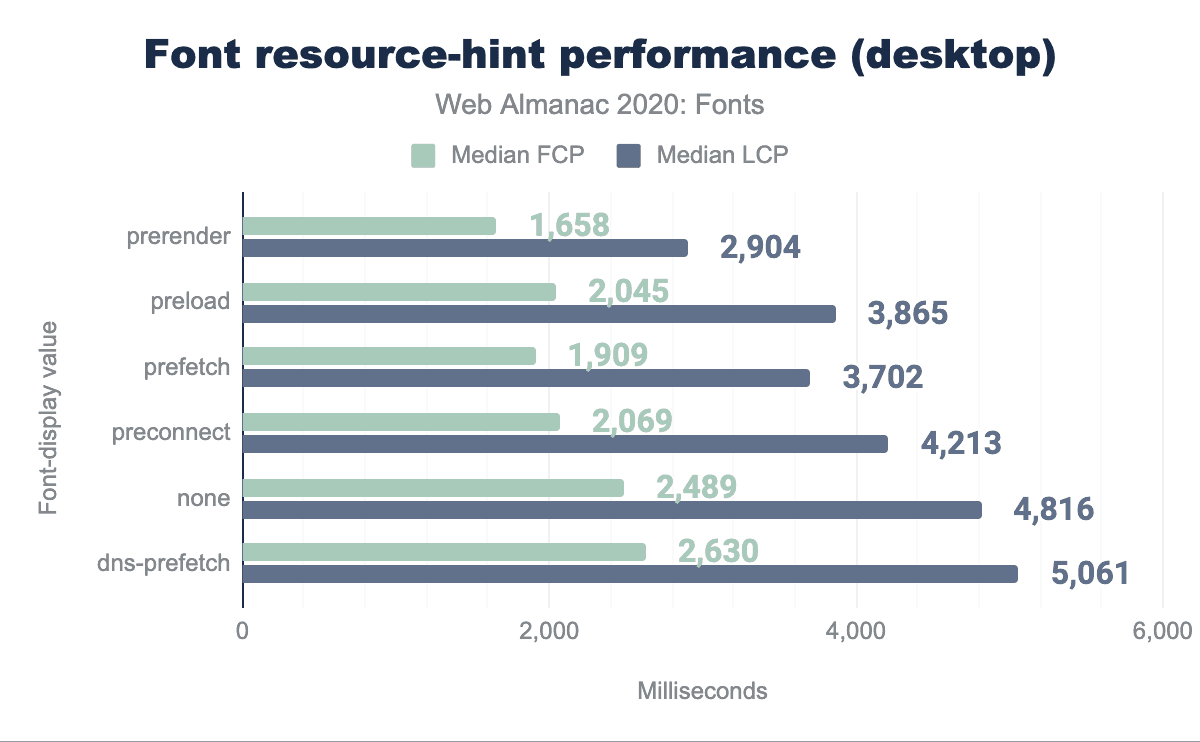 prerenderではFCPの中央値が1,658ms、LCPの中央値が2,904ms、preloadではそれぞれ2,045msと3,865ms、prefetchでは1,909msと3,702ms、preconnectでは2,069msと4,213ms、noneでは2,489msと4,816ms、dns-prefetchでは2,630msと5,061msとなっています。prerenderはFCPの中央値が3,387ms、LCPの中央値が7,362ms、preloadはそれぞれ4,900msと8,222ms、prefetchは4,942msと8,191ms、preconnectは4,858msと9,131ms、noneは5,825msと10,027ms、dns-prefetchは5,908msと9,962msとなっています。このデータを分析すると、dns-prefetch設定は、もっとも一般的な設定であるにもかかわらず、あまりパフォーマンスを改善していないことがわかります。おそらく、人気のあるWebフォントサーバのDNSは、いずれにせよキャッシュされていると思われます。他の設定では、使いやすさ、柔軟性、パフォーマンスの向上の点で、preconnectがもっとも優れています。2020年3月現在、Google Fontsは、HTMLソースのCSSリンクの直前にこの行を追加することを推奨している。