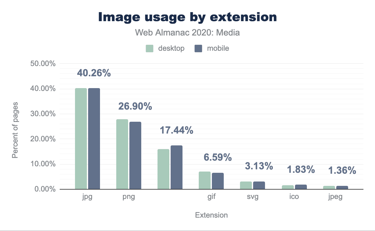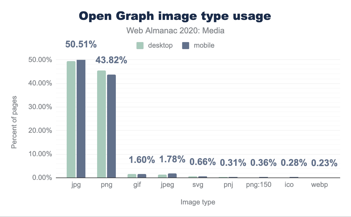 Open Graphプロトコルでは、画像や動画のURLは1つしか含めることができません。<picture>srcsetで提供されるようなコンテキストに応じた柔軟性はありません。そのため、作者はマイクロブラウザに送信するフォーマットを選ぶ際に、どちらかというと保守的になりがちです。マイクロブラウザ専用画像の半分はJPEG、45%はPNG、2%弱はGIFです。WebPは、マイクロブラウザ用画像の0.2%に過ぎません。
