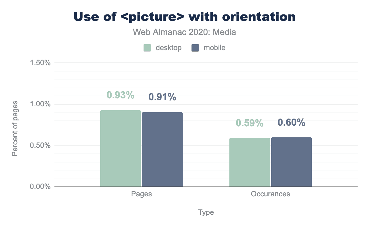 データによると、<picture>を使用しているページのうち、オリエンテーションを利用しているのは1%弱に過ぎませんが、ウェブサイトのデザイナーや開発者にとっては、さらに検討すべき分野であると感じています。