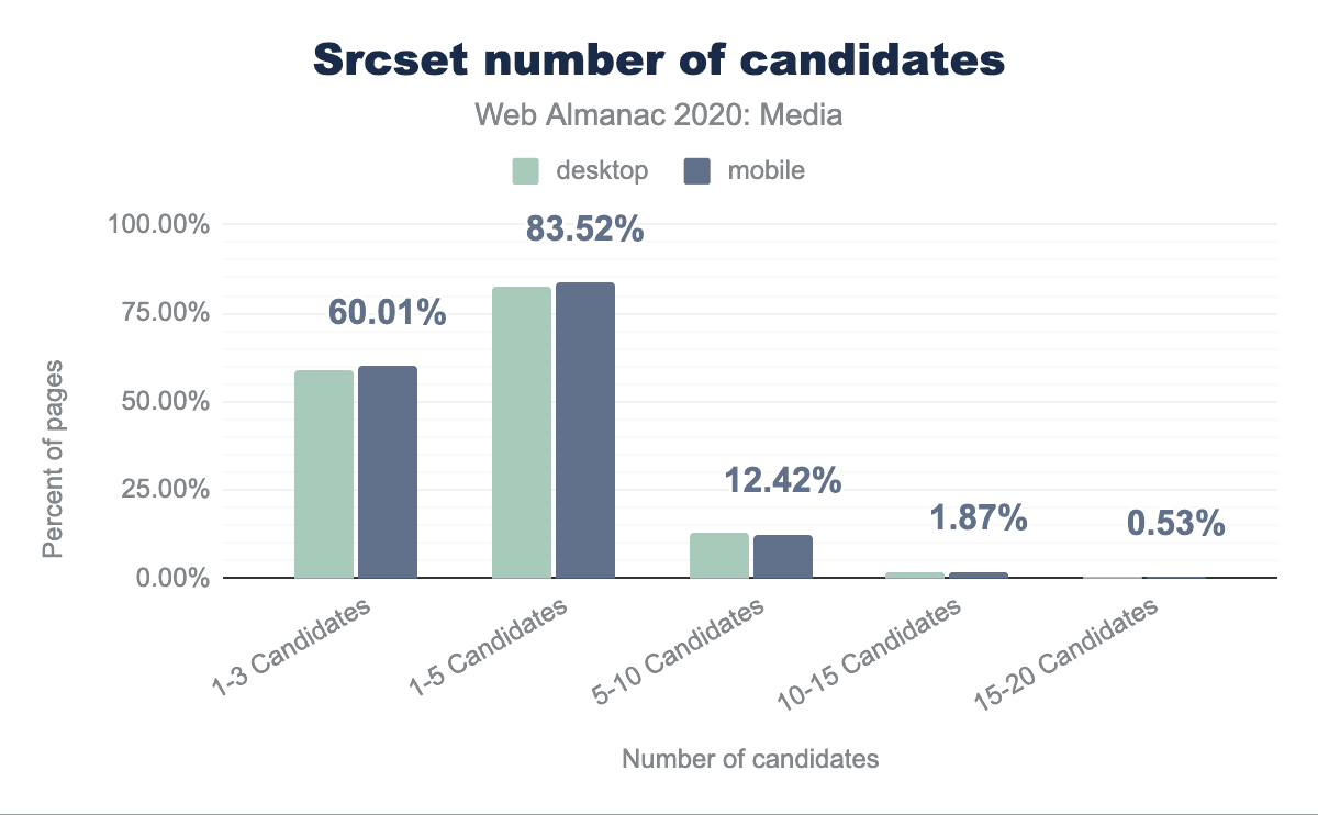 2020年のデータでは、srcsetを使用しているサイトの約35%がsizesと組み合わせていませんでした。ブラウザは喜んでsizes="100vw"のデフォルトに戻りますが、この属性をオフにしておくと、技術的に正しくありません。この見落としにより、もっとも適切な画像候補を決定する数学に欠陥があり、しばしば不必要に大きな画像がリクエストされてしまうケースが定期的に発生しています。