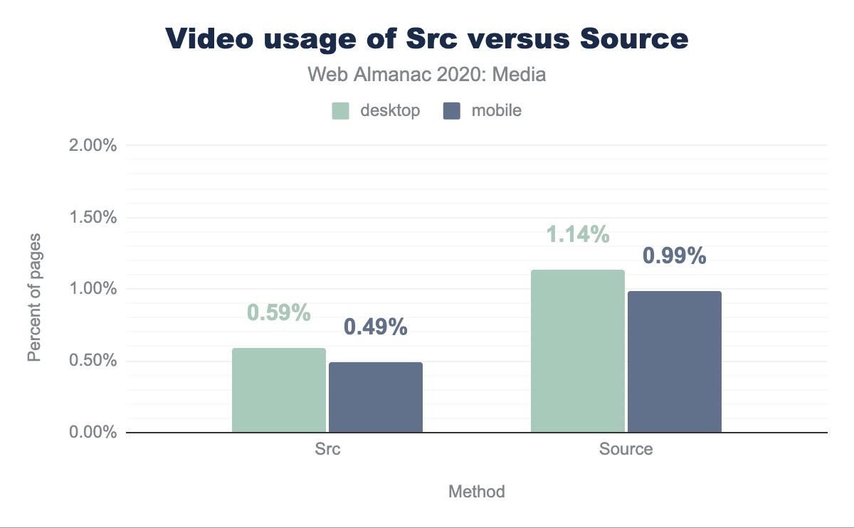 当然のことながら、もっとも一般的なタイプの値はvideo/mp4です。しかし、次に多いのは、デスクトップ用のタイプの15%、モバイル用クローラーに送信されるタイプの20%を占めるvideo/youtubeで、これは登録されたMIMEタイプではありません。これは、登録されたMIMEタイプではなく、(WordPressを含む)いくつかのプレイヤーがYouTubeの動画を埋め込む際に使用する特別な値です。さらに、Vimeoの埋め込みにも同様のパターンが見られます。