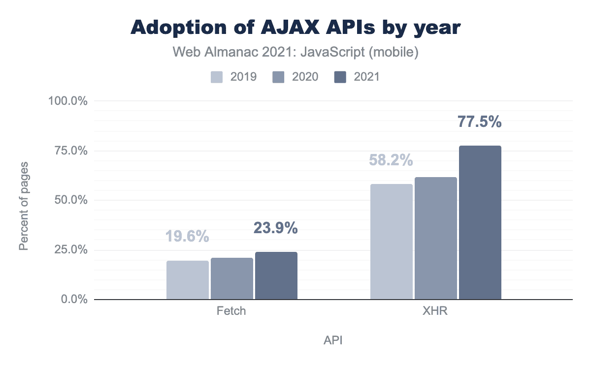 FetchとXHRの両方において、ここ数年で使用量が大幅に増加しています。モバイルページでの Fetch の使用率は4ポイント、XHRは19ポイント上昇しています。Fetchの採用が徐々に増加していることは、よりクリーンなリクエストと優れたレスポンス処理の傾向を示しているように思われます。