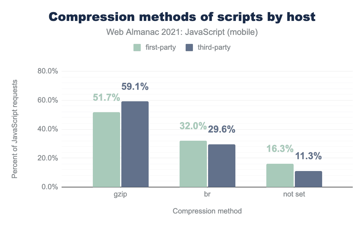 興味深いことに、2019年のJavaScript圧縮の状況と比較すると、Gzipは10ポイント近く下がり、Brotliは16ポイント上がっています。この傾向は、Gzipと比較してBrotliが提供する圧縮レベルは高く、より小さいサイズのファイルを重視するようになったことを示しています。