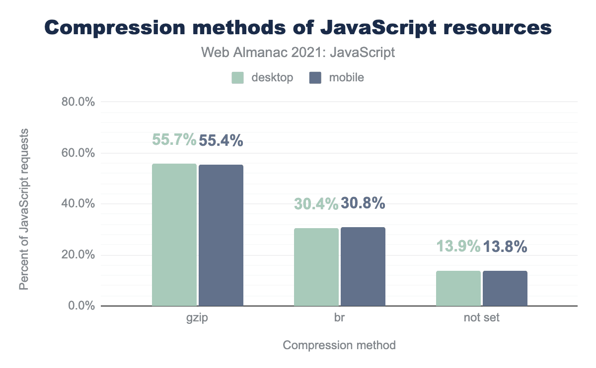 ほとんどのJavaScriptリソースは、Gzip、Brotli (br) を使って圧縮されているか、あるいはまったく圧縮されていない(設定されていない)かのいずれかです。モバイルのJavaScriptリソースの55.4%がGzipで圧縮されているのに対し、30.8%がBrotliで圧縮されています。
