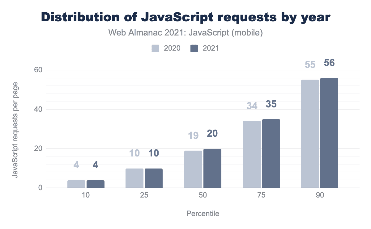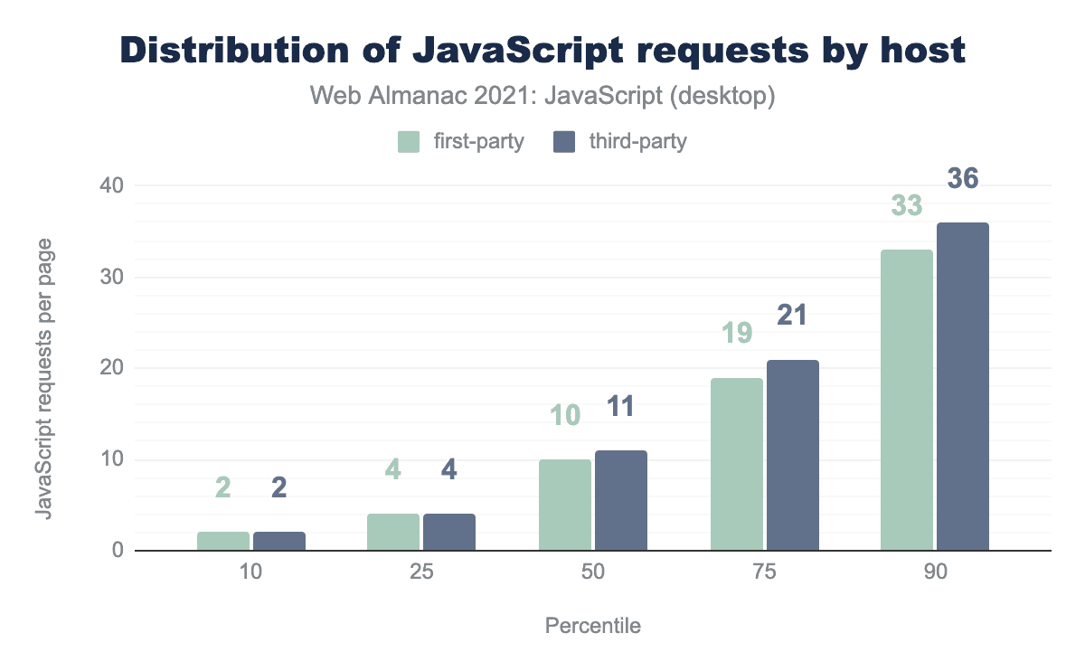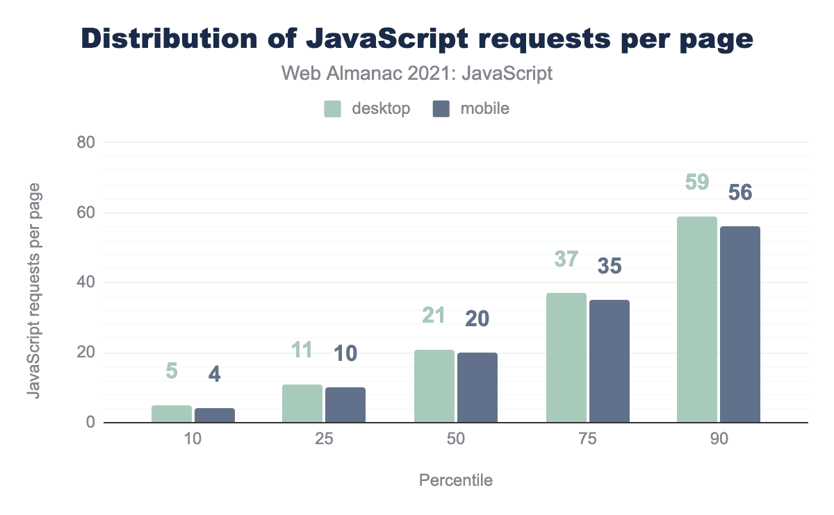 デスクトップページの中央値では、21個のJavaScriptリソース(.jsおよび.mjsのリクエスト)がロードされ、90パーセンタイルでは59個のリソースがロードされます。