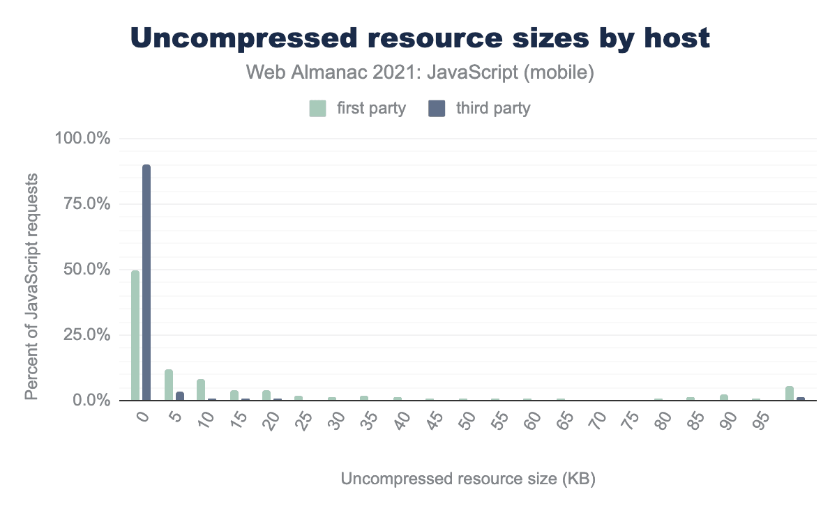 圧縮されていないサードパーティのJavaScriptリソースの90%は5KB未満ですが、ファーストパーティからのリクエストは少し遅れています。このことは、多くのJavaScriptリソースが圧縮されない理由を説明するのに役立つかもしれません。小さなリソースを圧縮することで得られる利益は減少するため、小さなスクリプトはネットワーク上で数バイトを節約することによるパフォーマンス上のメリットよりも、サーバー側での圧縮とクライアント側での解凍によるリソース消費の方が、大きくなる可能性があります。