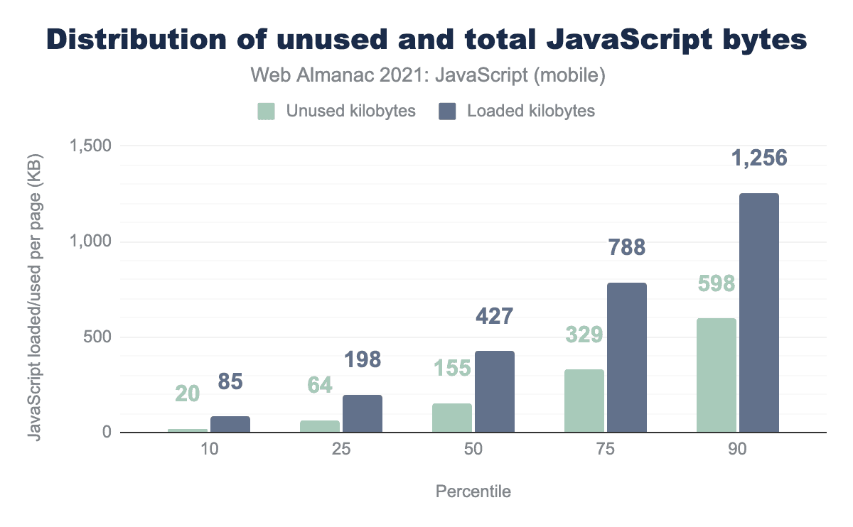 言い換えれば、中央値のモバイルページでは、36.2%のJavaScriptバイトが使用されていません。JavaScriptがページの最大コンテンツの描画(LCP)に与える影響を考えると、とくにデバイスの性能やデータプランが限られているモバイルユーザーにとっては、CPUサイクルや他の重要なリソースがムダに消費されていることを考えると、これは非常に大きな数字です。このようなムダは、大規模なフレームワークやライブラリに同梱されている、使用されていない多くの定型的なコードの結果である可能性があります。