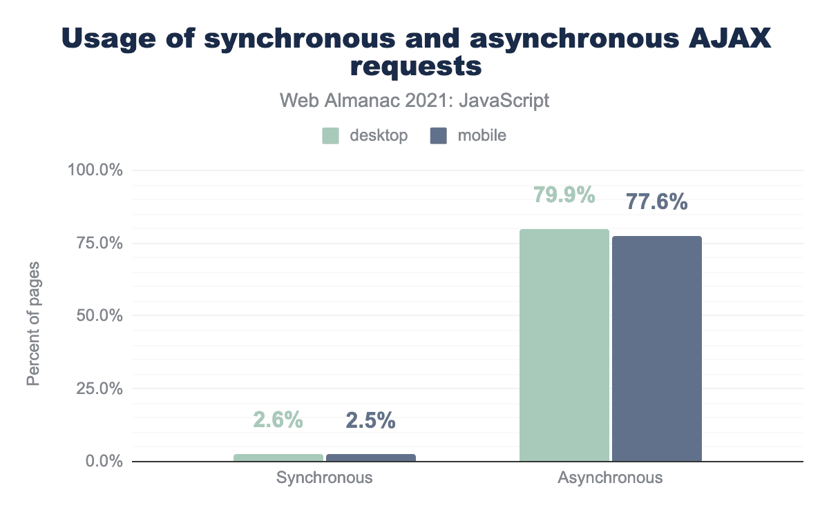 モバイルページの2.5%が、非推奨の同期型AJAXリクエストを使用しています。これを踏まえて、過去2年間の結果と比較して、その傾向を見てみましょう。