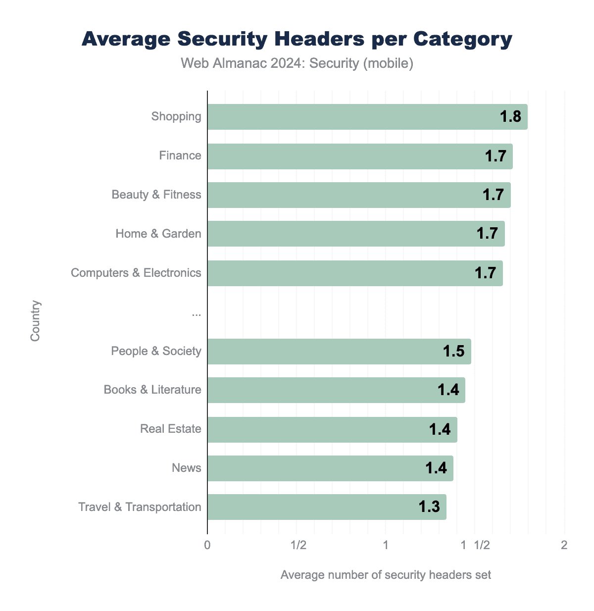 図11.46. ウェブサイトのカテゴリ別の平均セキュリティヘッダー数。上位5カテゴリと下位5カテゴリ。