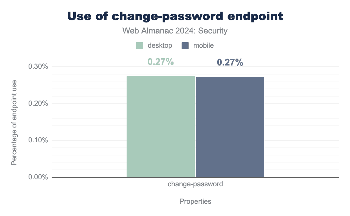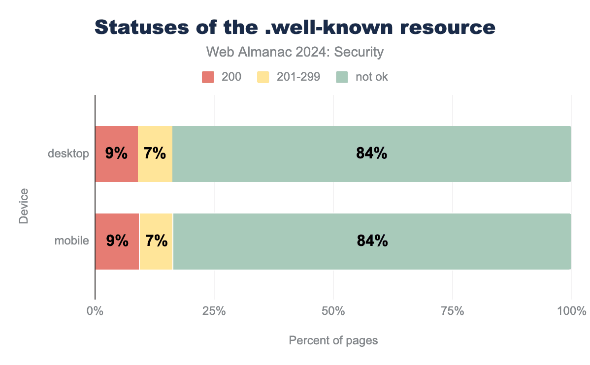 採用率は依然として非常に低いです。モバイルとデスクトップの両サイトで0.27%で、2022年の0.28%からデスクトップサイトではわずかに減少しました。標準化プロセスが遅いため、採用率があまり変わらないのは予想外ではありません。また、認証メカニズムのないウェブサイトはこのURLを使用しないため、実装しても無意味であることも繰り返します。
