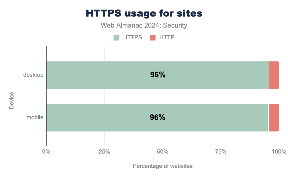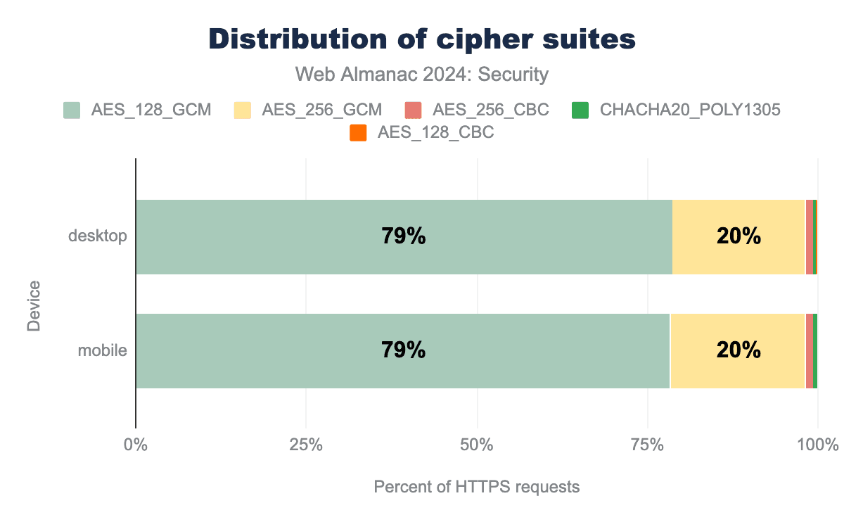 2022年の前回Almanac以降、TLSを使用して提供されるリクエストの数はさらに4%上昇し、モバイルでは98%になりました。