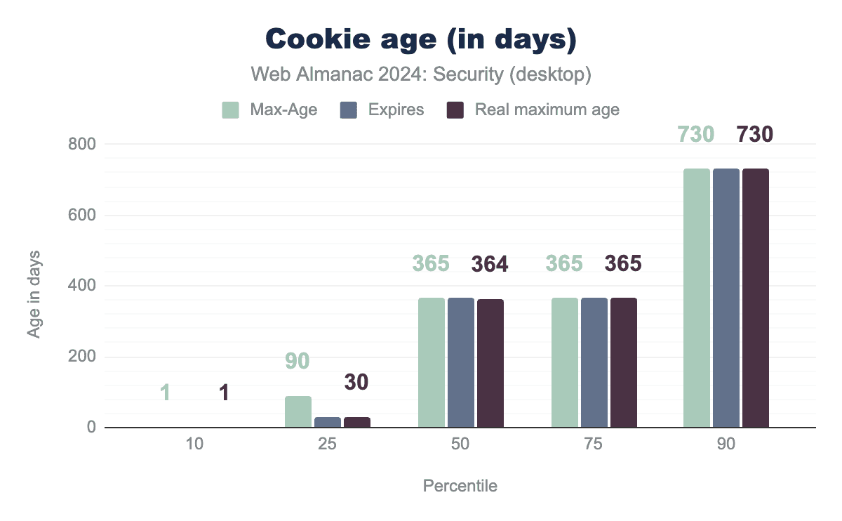 クッキーの有効期間の分布は、昨年と比較してほとんど変わっていません。しかし、それ以来、クッキー標準の作業草案が更新され、クッキーの最大有効期間が400日に制限されました。この変更はすでにChromeとSafariで実装されています。上記のパーセンタイルに基づくと、これらのブラウザでは、観測されたすべてのクッキーの10%以上が、この400日の制限に有効期間が上限付けられています。