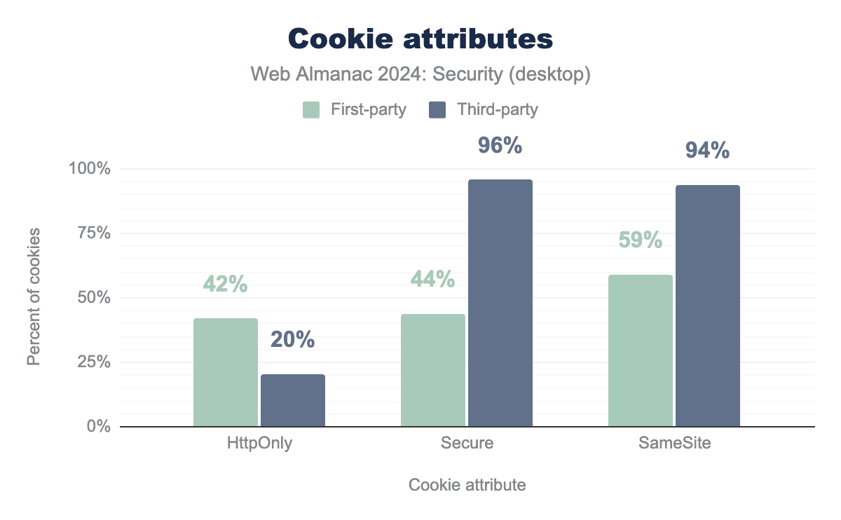 Secure属性の使用は、年々着実に増加しています。2022年以降、ファーストパーティコンテキストで7%、サードパーティコンテキストで6%のクッキーがこの属性で設定されています。セキュリティの章の以前の版で議論したように、2つのコンテキスト間の採用の大きな違いは、主にSameSite=Noneを持つサードパーティクッキーもSecureとしてマークする必要があるという要件によるものです。これは、望ましい非デフォルト機能を有効にするための追加のセキュリティ前提条件が、セキュリティ機能の採用の効果的な推進力であることを浮き彫りにしています。