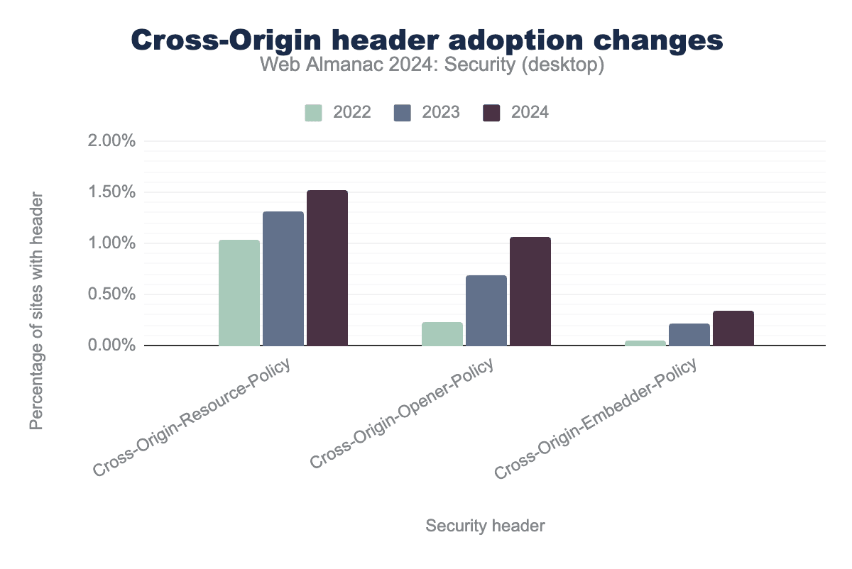 さらに、観測されたCOOPヘッダーのわずか0.26%がcross-originに設定されており、CORPヘッダーのわずか0.02%が値unsafe-noneを使用していました。これらの値が誤って間違ったヘッダーに適用されたとしても、それらは利用可能なもっとも寛容なポリシーを表しています。したがって、これらの構成ミスはセキュリティを低下させるとは見なされません。