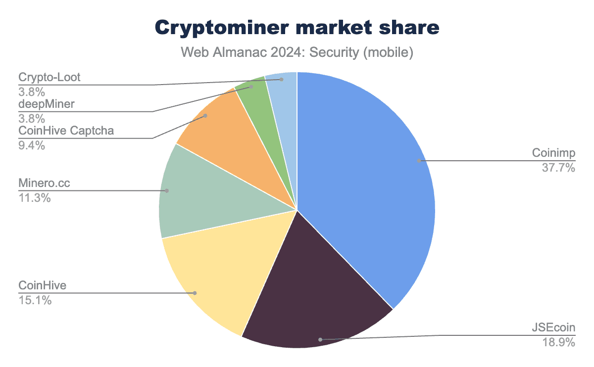 暗号マイナーのシェアを見ると、Coinimpのシェアの一部がJSEcoinに追い抜かれている一方で、他のマイナーは比較的安定しており、わずかな変化しか見られません。ウェブ上で見つかる暗号マイナーの数が少ないため、これらの相対的な変化は依然として非常に小さいです。