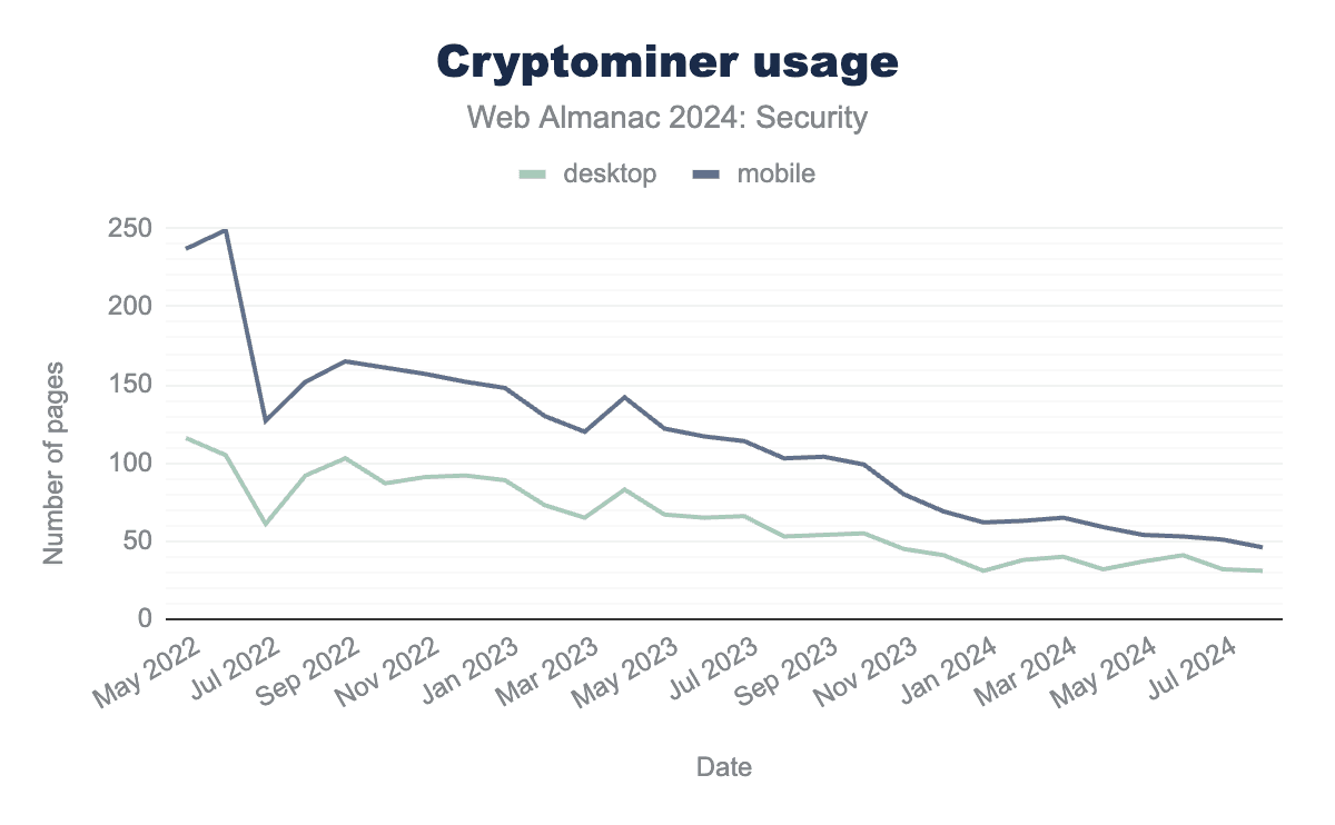 暗号通貨は依然として人気がありますが、ウェブ上の暗号マイナーの数は過去2年間で減少し続けており、2022年版のWeb Almanacで説明されているように、使用量が著しく急増することはありませんでした。