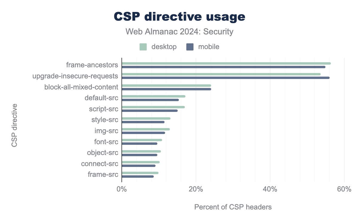 ほとんどのウェブサイトは、埋め込みリソースの制御以外の目的でCSPを利用しており、upgrade-insecure-requestsframe-ancestorsディレクティブがもっとも人気があります。