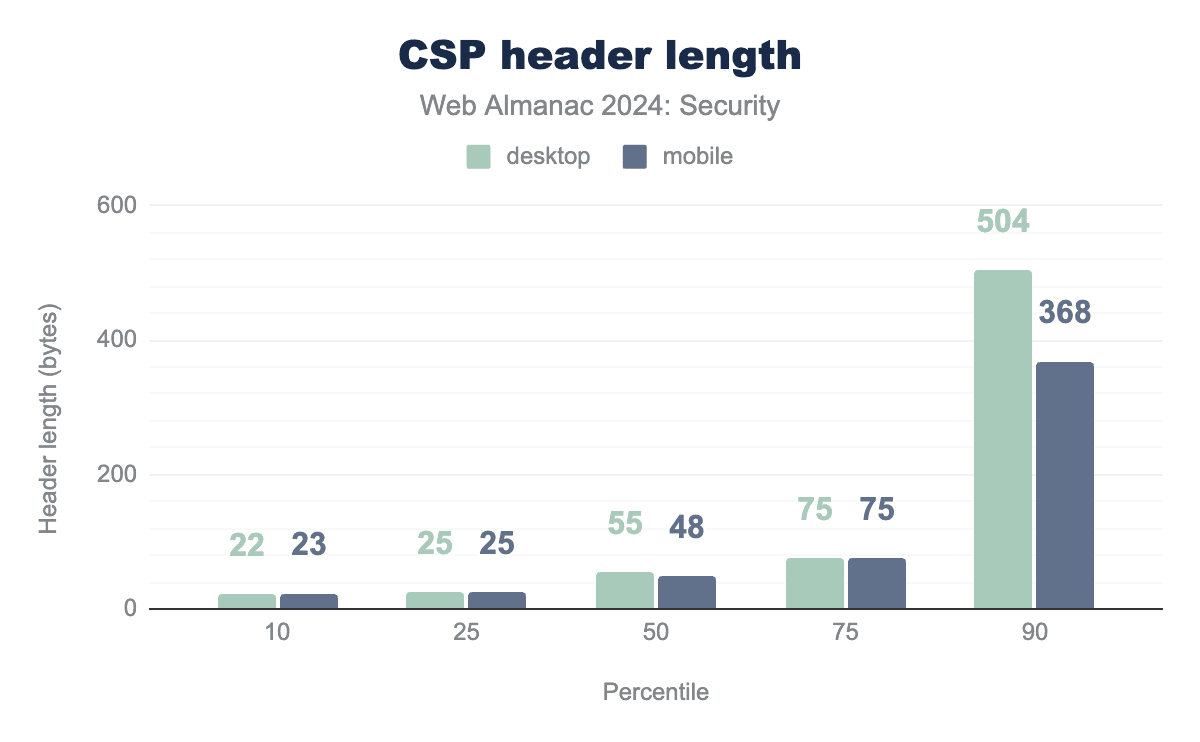 有効なmax-ageを持つリクエストの割合は95%で変わっていません。他のオプションのディレクティブ(includeSubdomainspreload)は、2022年と比較してそれぞれ1%わずかに増加し、モバイルでは35%と18%になりました。HSTS仕様の一部ではないpreloadディレクティブは、includeSubdomainsを設定する必要があり、また1年以上(または31,536,000秒)のmax-ageを必要とします。
