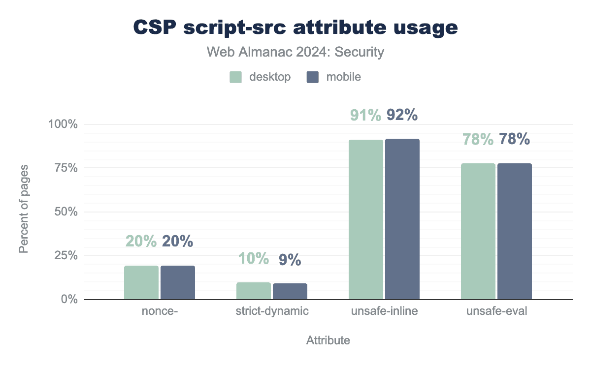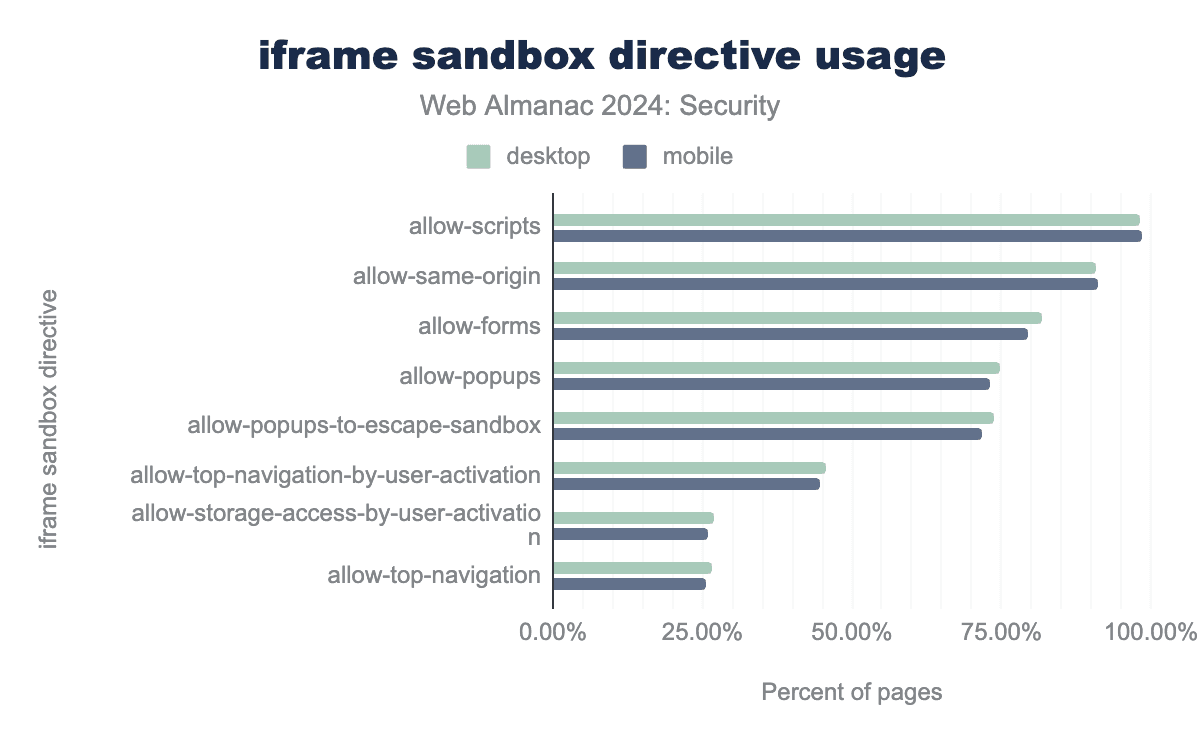 コンテンツセキュリティポリシーは<meta>タグを使用して定義できますが、そのframe-ancestorsおよびsandboxディレクティブはこのコンテキストではサポートされていません。それにもかかわらず、私たちの観察によると、デスクトップで<meta>タグのCSPを使用するページの1.70%、モバイルで1.26%が、誤って<meta>タグでframe-ancestorsディレクティブを使用していました。これは、許可されていないsandboxディレクティブでははるかに低く、0.01%未満で定義されていました。