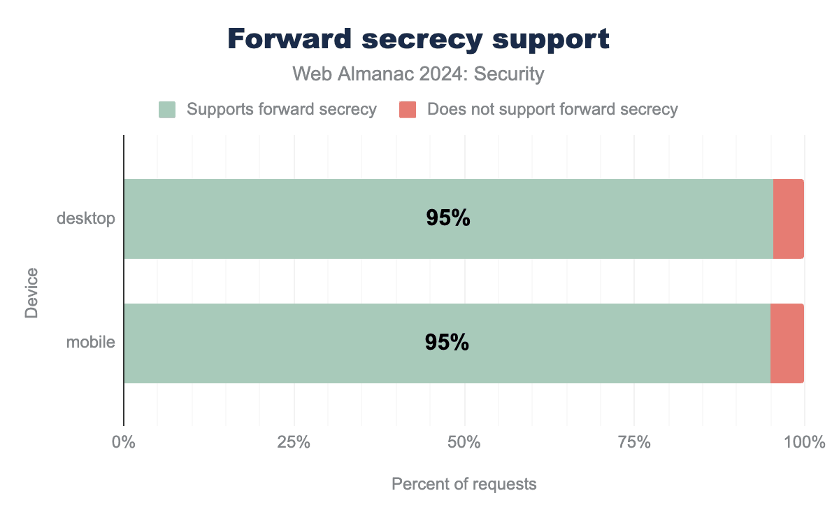 TLS1.3は前方秘匿性を必須としているため、ウェブ上で広くサポートされています。前方秘匿性とは、使用中の鍵が漏洩した場合でも、その鍵を使用して接続上で送受信された将来または過去のメッセージを復号できないことを保証する機能です。これは、長期的なトラフィックを保存している攻撃者が、鍵を漏洩させたとたんに会話全体を復号できないようにするために重要です。興味深いことに、前方秘匿性の使用は今年、約2%低下し、95%になりました。