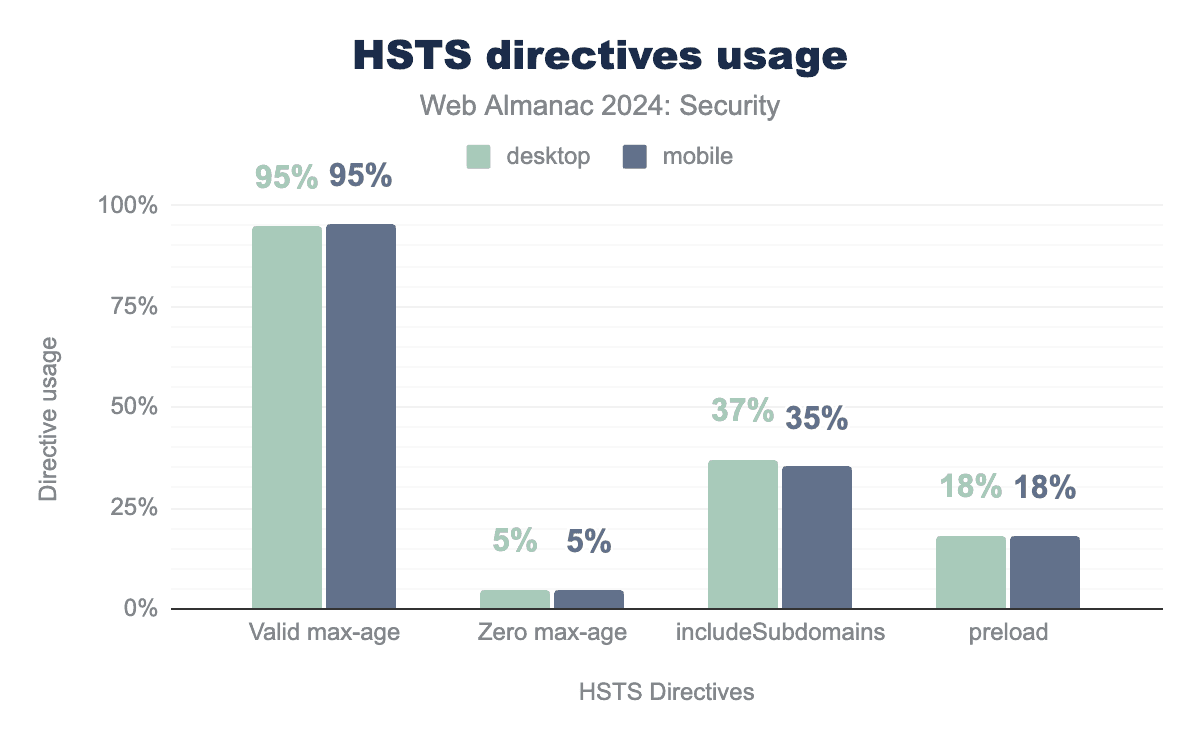 現在、モバイルのレスポンスの30%がHSTSヘッダーを持っており、これは2022年と比較して5%の増加です。ヘッダーのユーザーは、ヘッダー値にディレクティブを追加することで、ブラウザに指示を伝えることができます。max-ageディレクティブは必須です。これはブラウザに、ページをHTTPS経由でのみ訪問し続けるべき時間を秒単位で示します。
