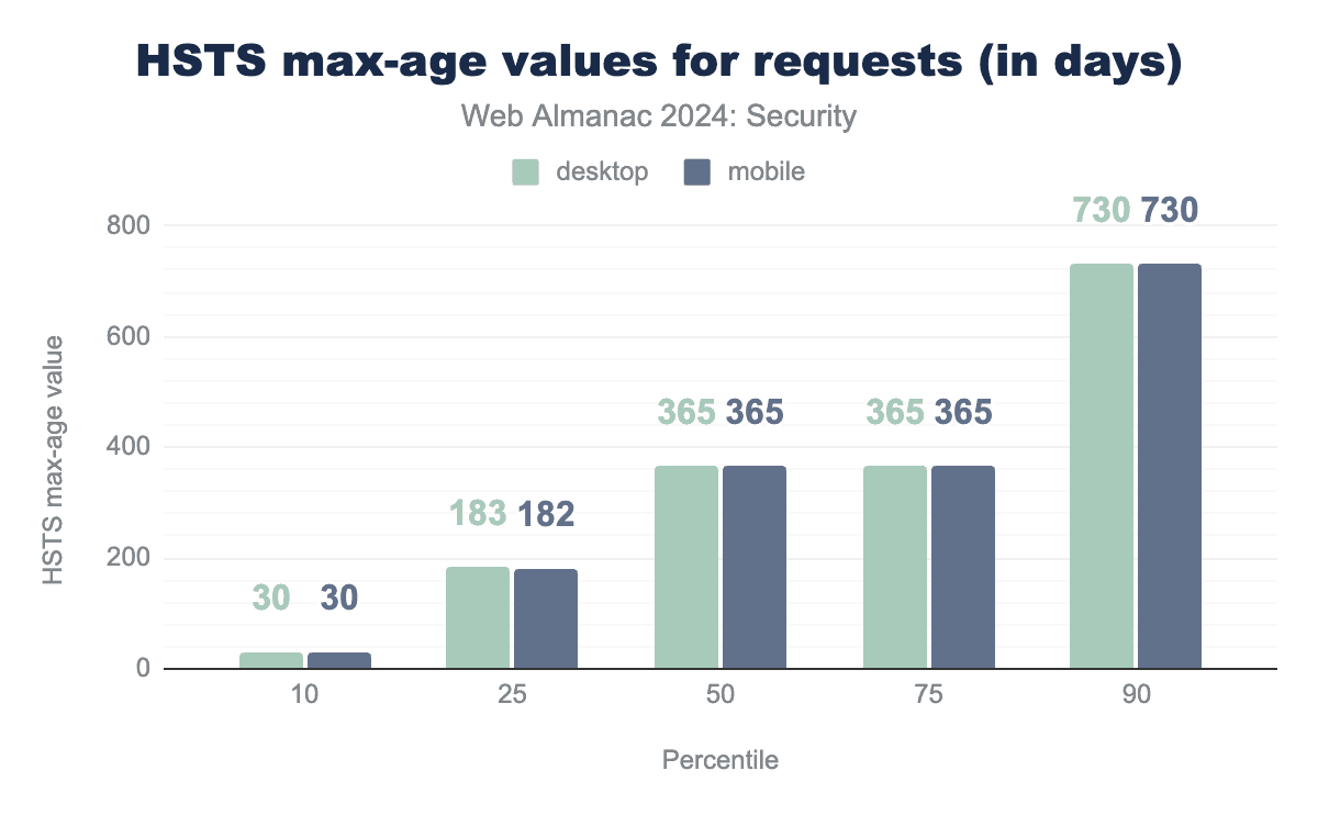 有効なmax-age値の分布は2022年とほぼ同じままで、例外としてモバイルの10パーセンタイルが72日から30日に減少しました。max-ageの中央値は1年のままです。