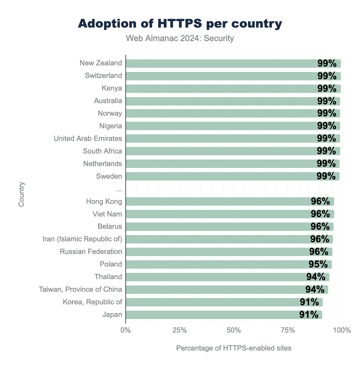 HTTPSは、トランスポート・レイヤー・セキュリティ(TLS)を使用して、クライアントとサーバー間の接続を保護します。ここ数年でTLSを使用するサイトの数は飛躍的に増加しました。例年同様、TLSの採用は増加し続けましたが、100%に近づくにつれてその増加は鈍化しています。