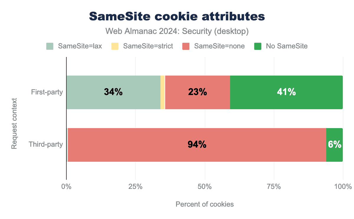 SameSite属性のないすべてのクッキーは、デフォルトでSameSite=Laxとして扱われることに注意することが重要です。その結果、ファーストパーティコンテキストで設定されたクッキーの合計75%が、事実上Laxに設定されているかのように扱われます。