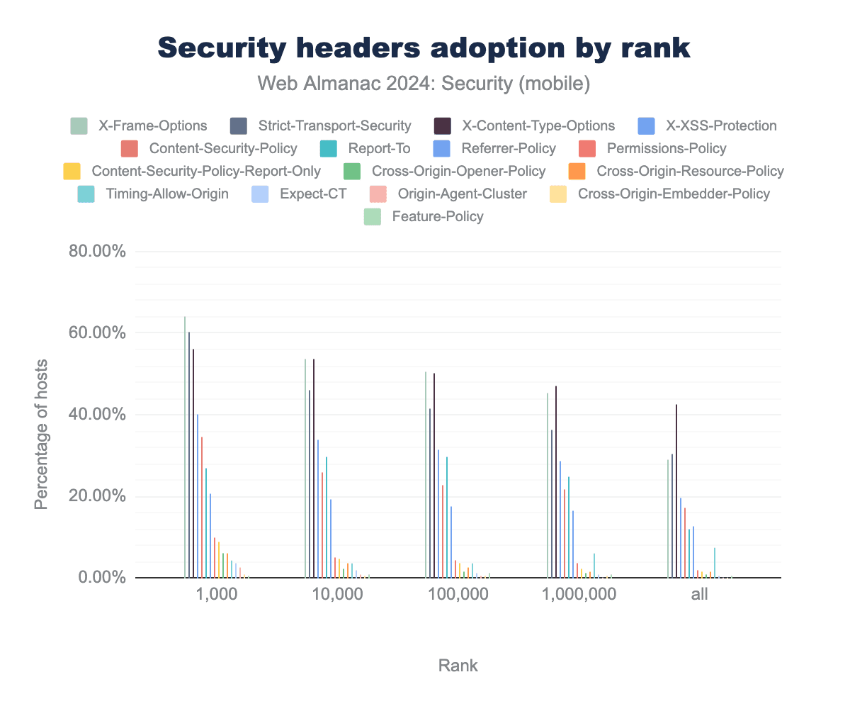 図11.45. 2024年4月のCrUXによるウェブサイトランク別のセキュリティヘッダー採用率。