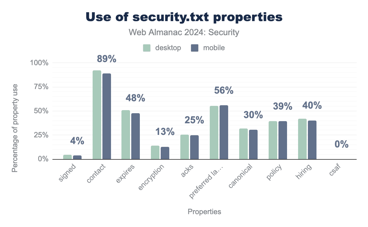security.txtファイルのほとんどには、連絡先情報(88.8%)と優先言語(56.0%)が含まれています。今年は、security.txtファイルの47.9%が有効期限を定義しており、2022年の2.3%と比較して大幅に増加しています。これは、今年の分析ではステータスコード200のすべてのレスポンスではなくテキストファイルのみを含めるという方法論の更新によって大部分が説明でき、それによって誤検知率が大幅に低下します。これは、security.txtを使用しているサイトの半分未満しか、(他の要件の中でも)expiresプロパティを必須と定義している標準に従っていないことを意味します。興味深いことに、security.txtファイルの39%しかポリシーを定義していません。これは、脆弱性を見つけたホワイトハッカーが脆弱性を報告するためにどのような手順を踏むべきかを開発者が示すことができるスペースです。