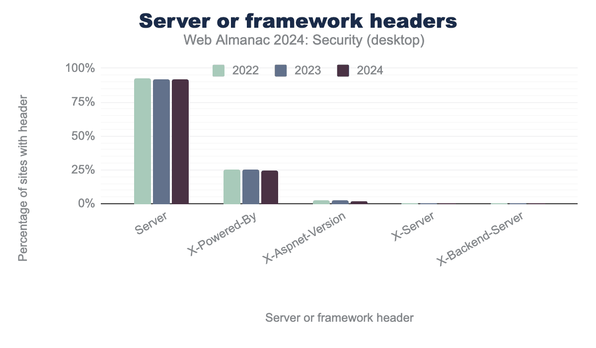 ServerおよびX-Powered-Byヘッダーのもっとも一般的な値を調べたところ、とくにX-Powered-Byヘッダーはバージョンを指定しており、上位10の値は特定のPHPバージョンを明らかにしていることがわかりました。デスクトップとモバイルの両方で、X-Powered-Byヘッダーの少なくとも25%にこの情報が含まれています。このヘッダーは、観測されたウェブサーバーでデフォルトで有効になっている可能性が高いです。分析には役立ちますが、ヘッダーの利点は限られているため、デフォルトで無効にすることが妥当です。ただし、このヘッダーを無効にするだけでは、古いサーバーのセキュリティリスクに対処することはできません。サーバーを定期的に更新することが引き続き重要です。