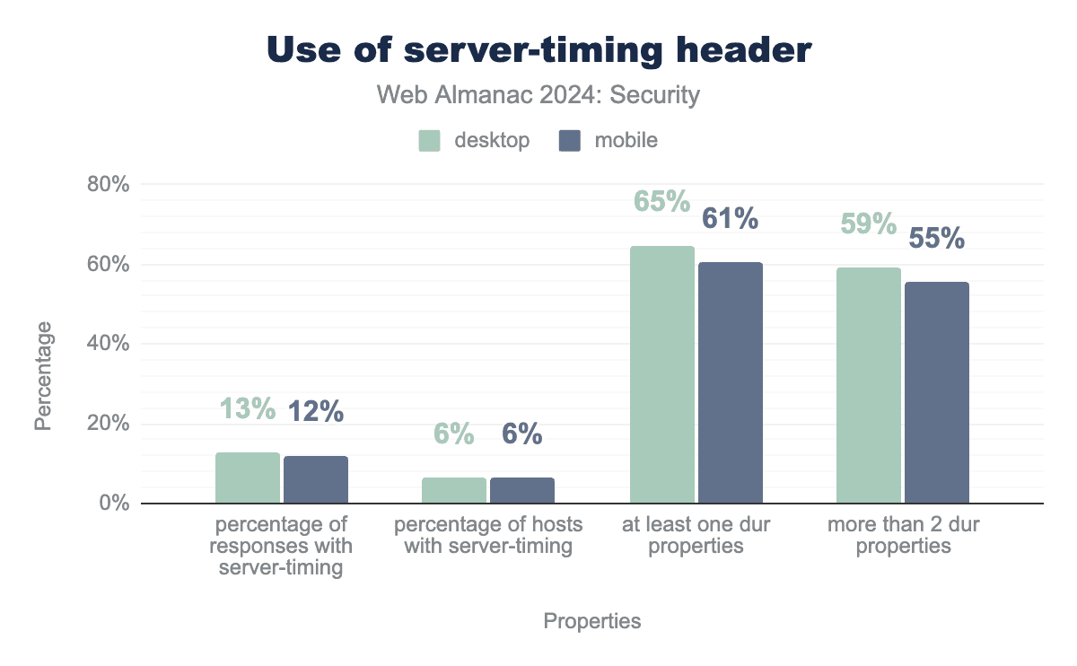 サーバータイミングは、インターネットホストの6.4%で使用されていることがわかります。これらのホストの60%以上が、レスポンスに少なくとも1つのdurプロパティを含んでおり、55%以上が2つ以上も送信しています。これは、これらのサイトがサーバー側の処理時間をクライアントに直接公開していることを意味し、悪用される可能性があります。サーバータイミングには機密情報が含まれている可能性があるため、前述のように開発者がTiming-Allow-Originを使用する場合を除き、使用は同一オリジンに制限されています。ただし、タイミング攻撃は、クロスオリジンデータにアクセスする必要なく、サーバーに対して直接悪用される可能性があります。