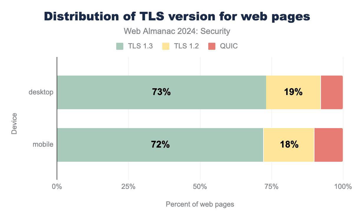 TLS1.3はウェブページの73%でサポートされ、使用されていることがわかります。QUICが2022年と比較して大幅に利用されるようになり、モバイルページの0%からほぼ10%に移行したにもかかわらず、TLS1.3全体の利用は増加しています。TLS1.2の利用は予想通り減少し続けています。前回のAlmanacと比較すると、モバイルページでは12%以上減少し、TLS1.3は2%強増加しました。TLS1.2の利用が減少し続けるにつれて、QUICの採用は増加し続けると予想されます。