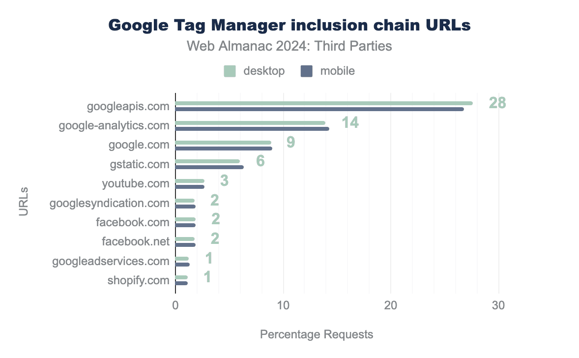 トップサードパーティドメインの1つである googletagmanager.com に注目してみましょう。これには googleapis.comgoogle-analytics.comgoogle.comgstatic.comyoutube.comgooglesyndication.comgoogleadservices.com など、多くのGoogleドメインが含まれています。googletagmanager.com に含まれるトップ10のサードパーティドメインのうち、非Googleドメインは3つだけで、Metaの facebook.comfacebook.net、そしてShopifyの shopify.com です。