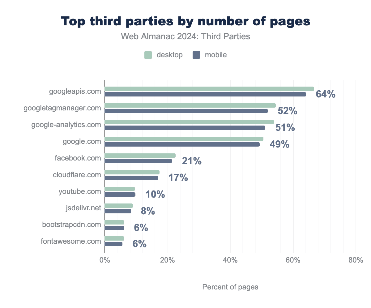 サードパーティは、ファーストパーティによって直接含まれていないことが多いことがわかりました。すべてのウェブページ上のサードパーティの約3分の1が、広告、アナリティクス、同意管理に使用されています。Googleはウェブ上で最も人気のあるサードパーティであり、トップ10のサードパーティドメインのうち5つがGoogleドメインです:googleapis.comgoogletagmanager.comgoogle.comgoogle-analytics.comyoutube.com